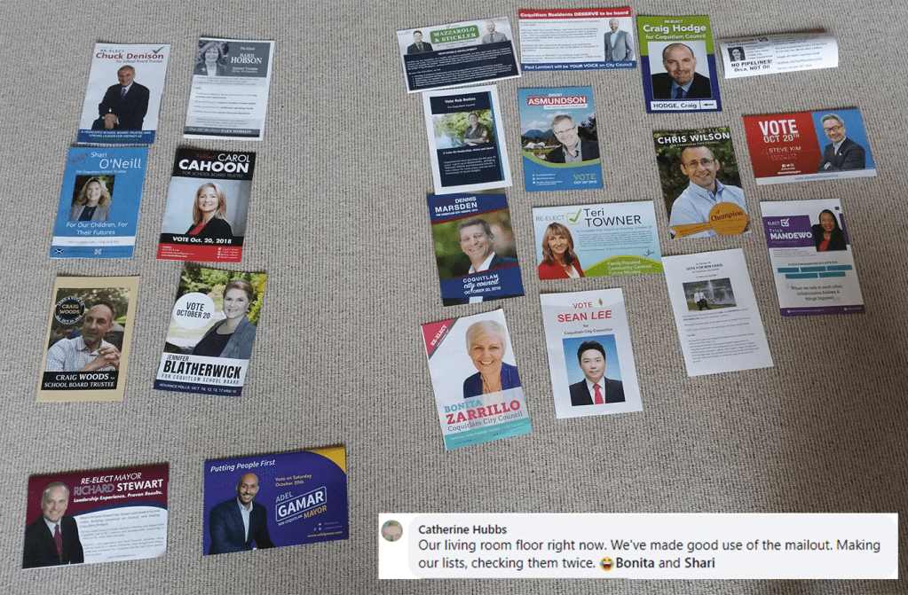 Every municipal election, the City of Coquitlam sends an envelope to its residents. This envelope includes flyers for candidates running in the election. Many residents believe this mail-out includes flyers for all of the candidates, but, unfortunately, that’s not the case.
