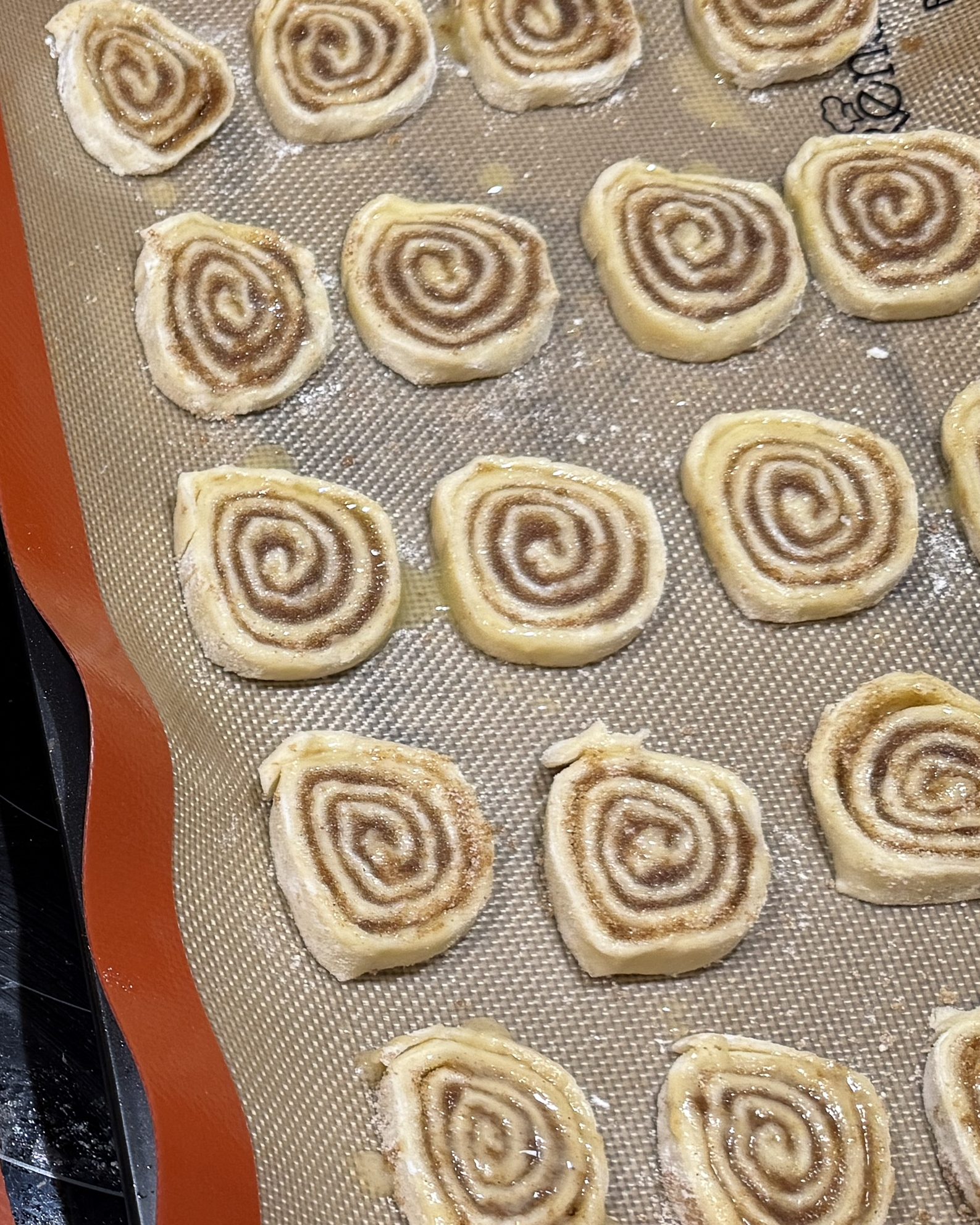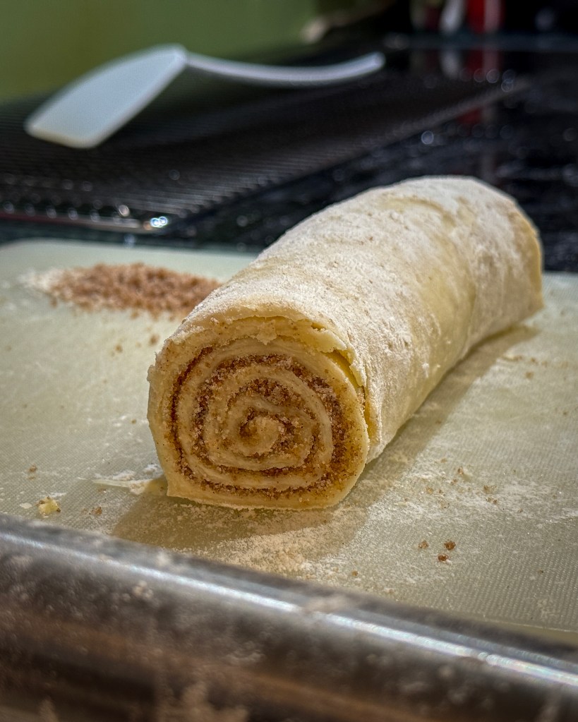Mix together 1/2 cup of white sugar, 1/2 cup of brown sugar, and 2 tablespoons of cinnamon. Sprinkle this mixture over the buttered dough, leaving a 1″ strip along one edge free of sugar. Roll your dough tightly toward the non-sugared edge of the dough, creating a log. Using a sharp knife and making quick, light passes, carefully slice 1/4″ rounds from your log.